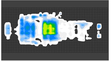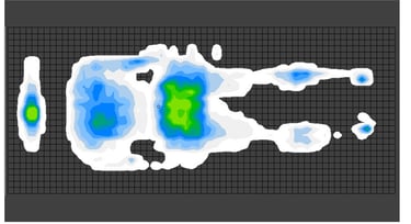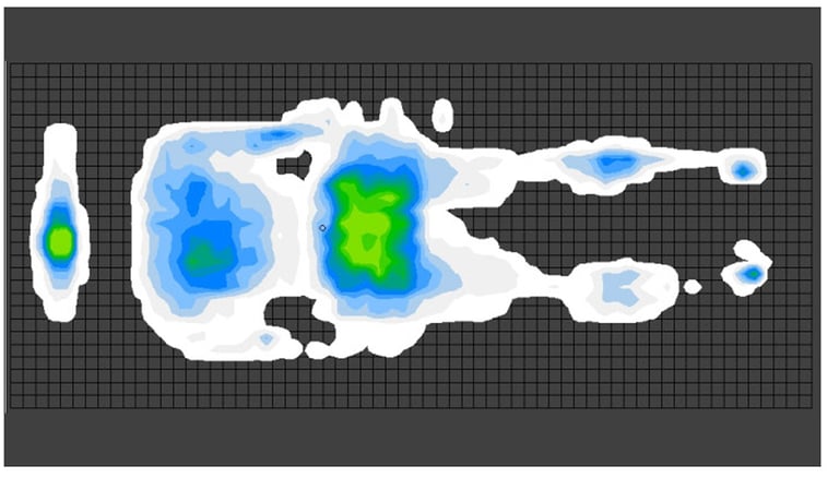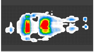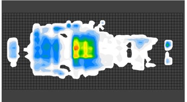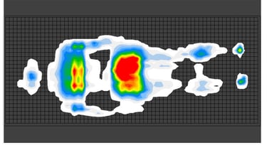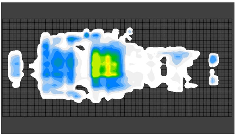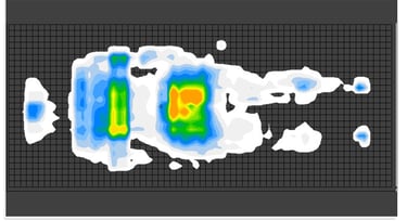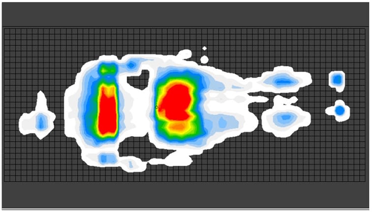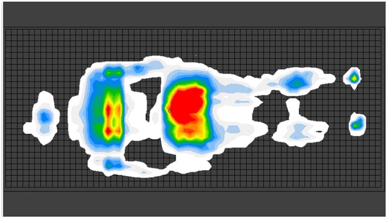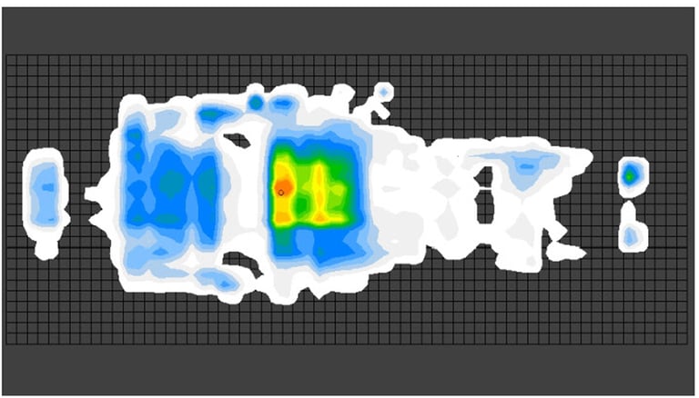 A presença de áreas vermelhas demonstra colchões excessivamente firmes, que podem gerar desconforto, dores no quadril e nos ombros, especialmente em quem dorme de lado, além de prejudicar o sono profundo (REM) devido ao aumento dos movimentos noturnos.